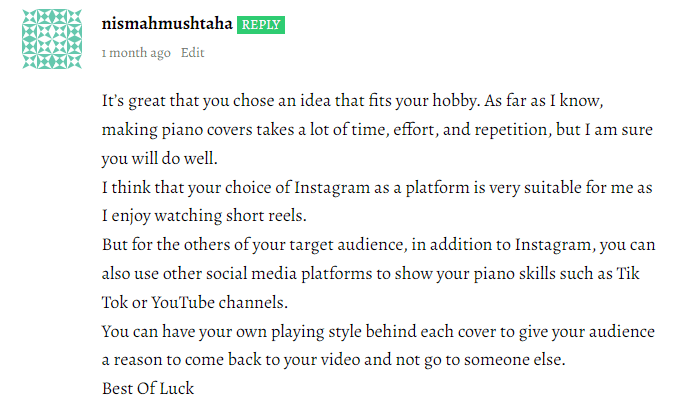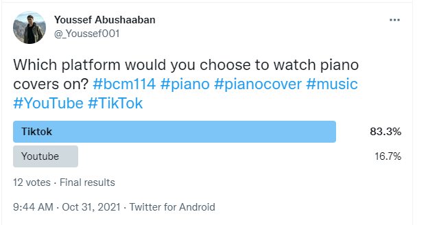 Based on the feedback I received on both platforms in terms of views, shares, likes, and comments; and the feedback of my collogues, I decided to change my platform to TikTok because I believe that I can reach my target audience on the platform, and I’m able to communicate my solution with a wider audience. Moreover, I empathized again and I discovered that the gaps, target audience, and the process of producing piano covers are the same on TikTok. Further, I am adopting #FEFO and #BEBO as a strategy in developing my DA, therefore such a breaking is important because it helps me improve my product. Moreover, I believe that my latest videos on TikTok are between high fidelity prototypes and final product stage.