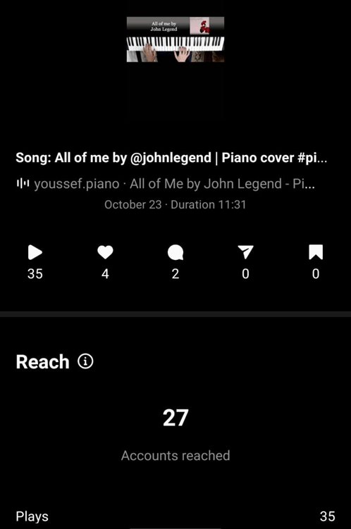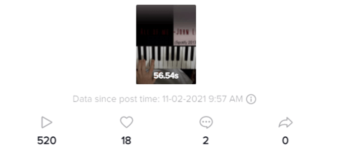 Furthermore, I compared my first reel on Instagram and my first video on TikTok, and I received higher engagement on TikTok (Both posts published on a Sunday Morning, and covering the same song, but different verses) (Image 13, 14). Moreover, I decided to experiment further, in which, I published another piano cover on both platforms at the same day and time, and with the same caption (mentions and hashtags). Further, I received higher engagement on the video published on TikTok (Image 15, 16).